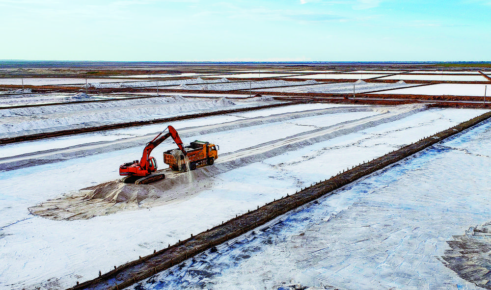 8月6日,内蒙古自治区鄂尔多斯市鄂托克前旗的北大池盐湖景色。夏末秋初之际,盐湖在夕阳照耀下闪烁着光芒。北大池盐湖占地面积39平方公里,已有2500年开采历史。王 正摄(中经视觉)
