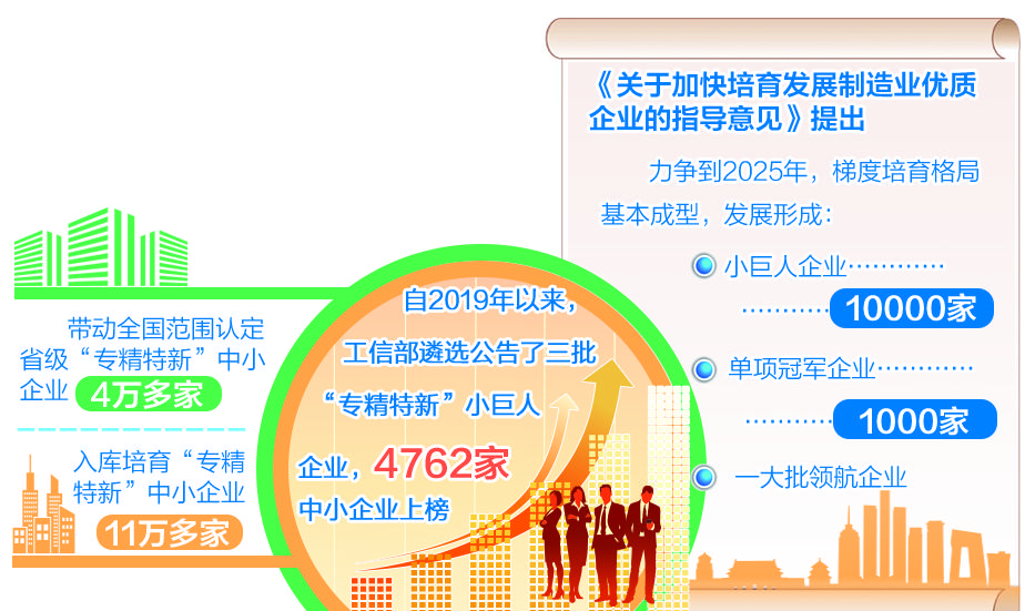 “企业不分大小,只要创新能力强、质量效益高、在制造业基础和产业链中发挥独特作用,都是制造业优质企业。”工业和信息化部相关负责人表示。“专精特新”中小企业通过进一步提升技术创新能力、市场竞争力和品牌影响力,可发展成为“小巨人”企业;“小巨人”企业和各类企业持续专注于细分产品市场的创新、产品质量提升和品牌培育,巩固和提升全球市场地位,可发展壮大成为单项冠军企业;聚焦重点领域,有条件的单项冠军企业和大企业集团不断增强国际竞争力,就能提升对产业链、供应链、创新链的引领整合能力,发展成为产业链领航企业,引领带动产业发展。