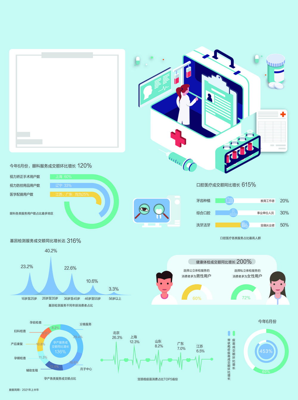 疫苗服务6月成交额环比增长60%、健康体检上半年成交额同比增长200%、基因检测服务成交额同比增长316%……一连串高增长的消费医疗数据,是民众自身疾病预防观念的提升,同时也映射出预防医疗产业发展的光明前景。
