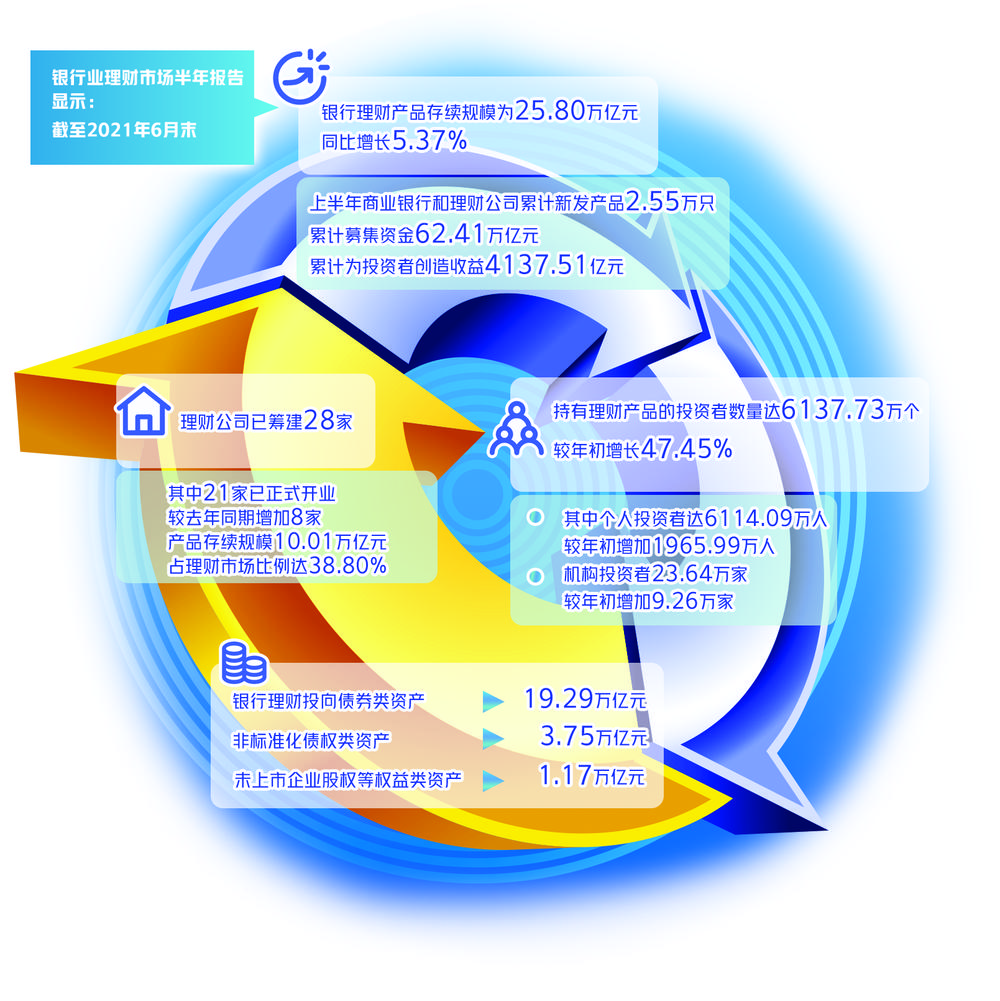 银行业理财登记托管中心日前发布《中国银行业理财市场半年报告(2021年上)》(以下简称《报告》)显示,截至2021年6月末,银行理财产品存续规模为25.80万亿元,同比增长5.37%,银行理财市场整体运行平稳。