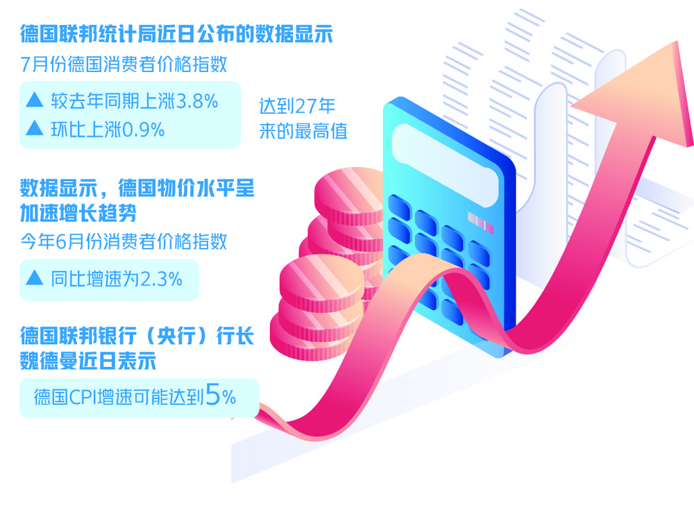 本报柏林讯(记者谢飞)德国联邦统计局近日公布的数据显示,7月份德国消费者价格指数(CPI)较去年同期上涨3.8%,环比上涨0.9%。数据显示,德国物价水平呈加速增长趋势。今年6月份消费者价格指数同比增速为2.3%,而7月份同比增速迅速升至3.8%,达到27年来的最高值。德国联邦银行(央行)行长魏德曼近日表示,德国CPI增速可能达到5%,但他认为此轮物价上涨仍为短期现象。