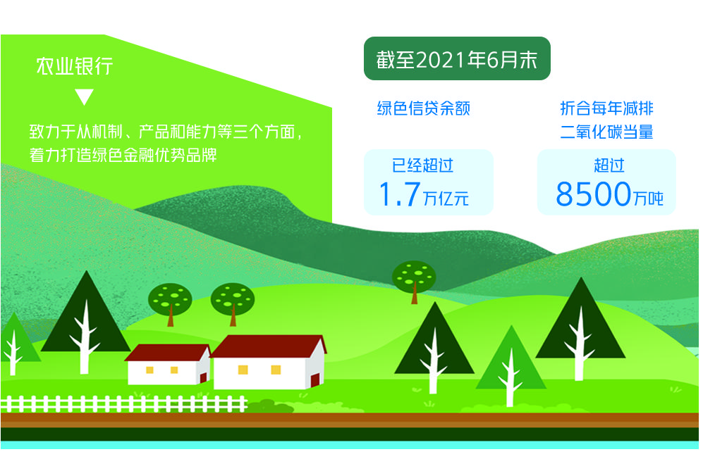 记者在采访中了解到,农业银行充分发挥集团综合经营优势,建立起涵盖绿色信贷、绿色投行、绿色租赁、绿色投资等多元化产品和全市场服务体系。近年来,农业银行推出了“绿色金融制造贷”“美丽乡村贷”“排污权质押贷”“绿色资产证券化”“碳中和债”等多个契合地方特色的绿色金融产品,取得了良好的社会效益和经济效益。例如,截至2021年6月末,农业银行支持了22个长江大保护项目,支持项目投资总额达500多亿元,惠及长江流域7省份21个县市。截至2021年6月末,按照中国银保监会统计口径,农业银行绿色信贷余额已经超过1.7万亿元,折合每年减排二氧化碳当量超过8500万吨。