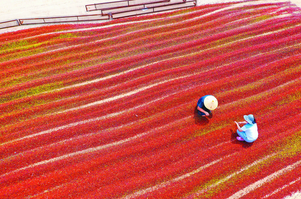 8月17日,山西运城市新绛县北张镇北杜坞村途明中药材专业合作社,社员在晾晒丰收的中药材酸枣。处暑将至,运城市秋收秋播秋种即将拉开序幕。连日来,农民抓紧农时,加强田管,抢收作物,乡村一派繁忙景象。