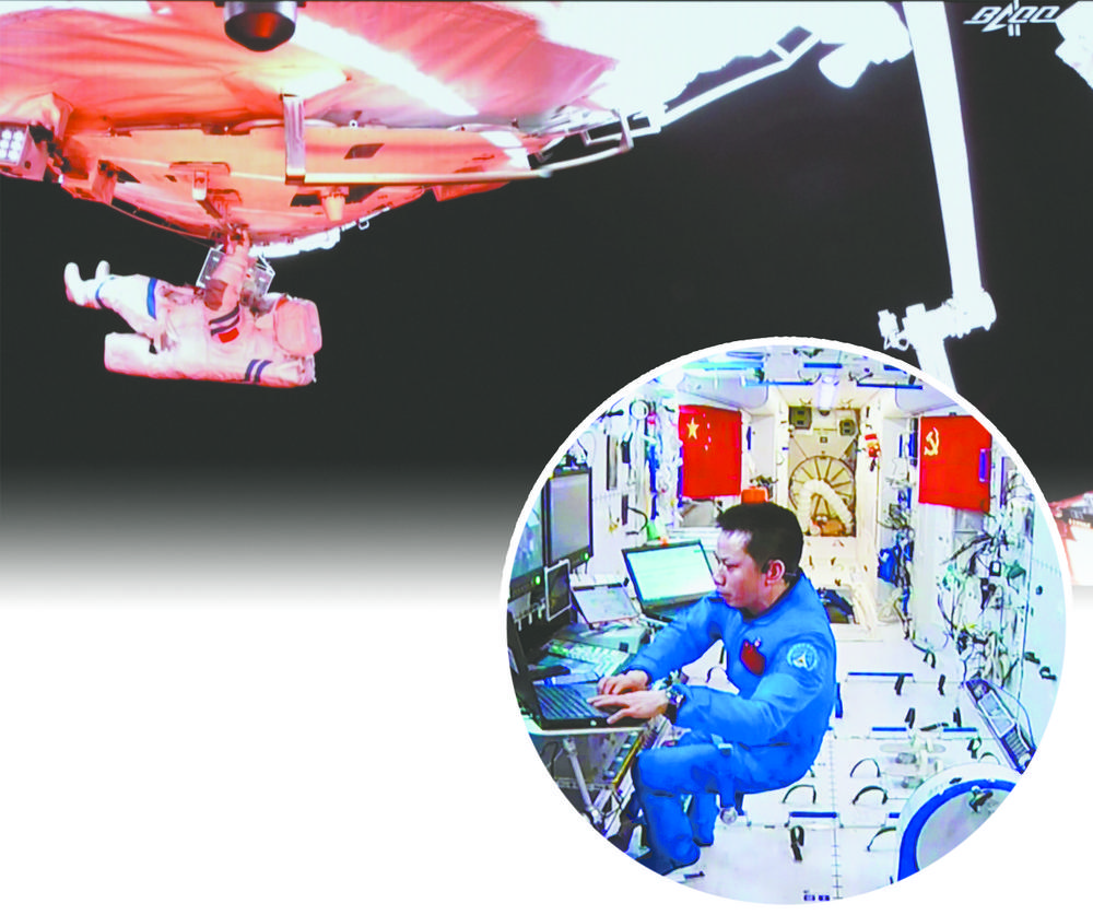 上图 8月20日在北京航天飞行控制中心大屏拍摄的神舟十二号乘组航天员在舱外工作场景。