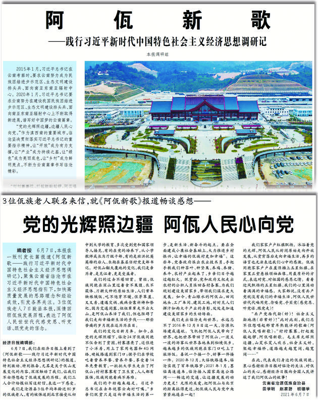 今年6月7日,本报刊发长篇报道《阿佤新歌》,聚焦当地脱贫攻坚取得的巨大成就,书写习近平新时代中国特色社会主义经济思想在边疆的生动实践。沧源县3位佤族老人阅读报道后致函本报,深情回顾佤族发展历程,表达了阿佤人民世世代代感党恩、听党话、跟党走的信念。