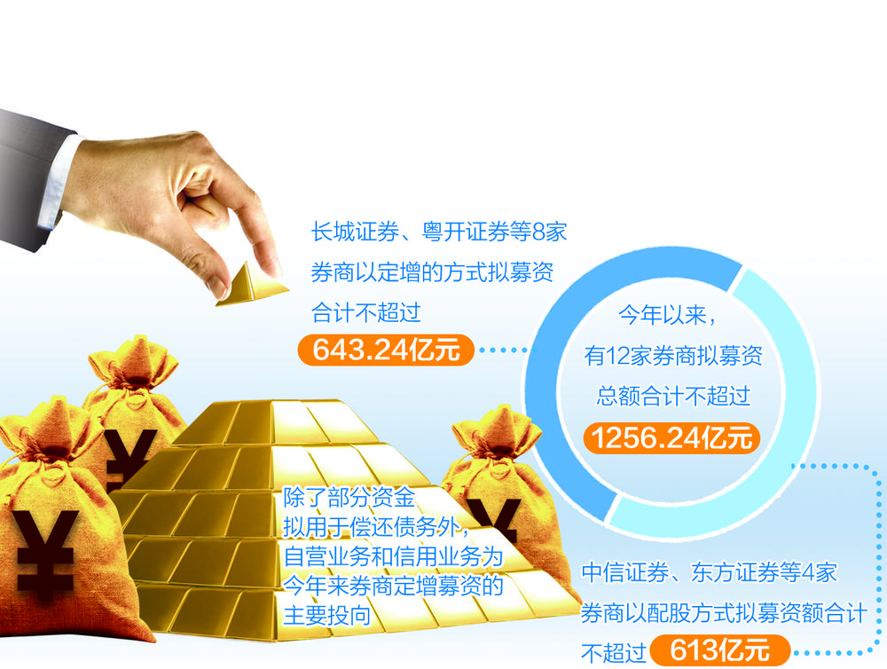今年以来,已有12家券商启动再融资“补血”方案,拟募资总额合计不超过1256.24亿元。其中,长城证券、粤开证券等8家券商以定增的方式拟募资合计不超过643.24亿元,中信证券、东方证券等4家券商以配股方式拟募资额合计不超过613亿元。