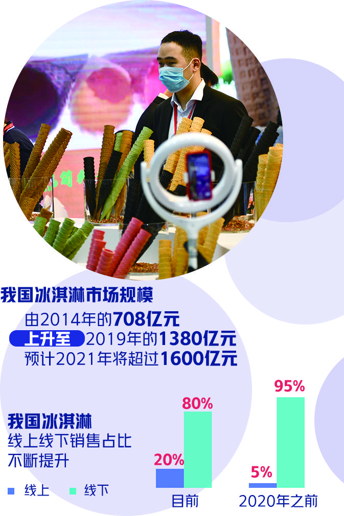 数据显示,我国冰淇淋市场已由2014年的708亿元上升至2019年的1380亿元,预计2021年将超过1600亿元。在冰淇淋市场规模激增背后,线上销售占比不断提高。前瞻产业研究院数据显示,目前我国冰淇淋的线上线下销售占比分别为20%和80%;2020年之前,冰淇淋线上线下的销售比例为5%和95%。