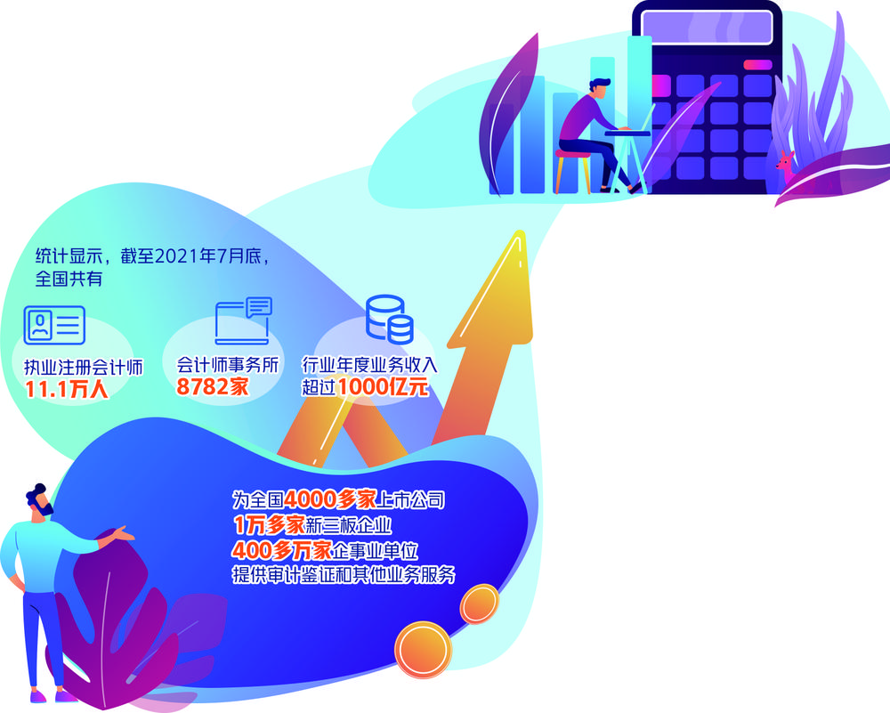 近年来,我国注册会计师行业规模不断扩大,服务范围不断拓展。统计显示,截至2021年7月底,全国共有执业注册会计师11.1万人,会计师事务所8782家,行业年度业务收入超过1000亿元,为全国4000多家上市公司、1万多家新三板企业和400多万家企事业单位提供审计鉴证和其他业务服务。