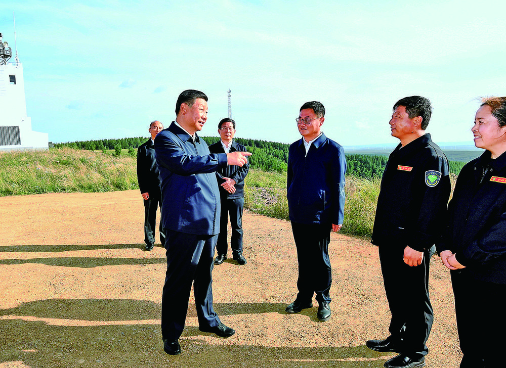 23日下午,习近平首先考察了位于河北省最北部的塞罕坝机械林场。八月的塞罕坝,林海苍翠连绵。林场始建于1962年。近60年来,塞罕坝林场的建设者们听从党的召唤,在“黄沙遮天日,飞鸟无栖树”的荒漠沙地上艰苦奋斗、甘于奉献,创造了荒原变林海的人间奇迹。习近平来到海拔1900米的月亮山,远眺林场自然风貌,听取河北省统筹推进山水林田湖草沙系统治理和塞罕坝机械林场情况介绍,对林场打造人防、技防、物防相结合的一体化资源管护体系,守护森林资源安全取得的成绩给予肯定。习近平强调,我国人工林面积世界第一,这是非常伟大的成绩。塞罕坝成功营造起百万亩人工林海,创造了世界生态文明建设史上的典型,林场建设者获得联合国环保最高荣誉——地球卫士奖,机械林场荣获全国脱贫攻坚楷模称号。希望你们珍视荣誉、继续奋斗,在深化国有林场改革、推动绿色发展、增强碳汇能力等方面大胆探索,切实筑牢京津生态屏障。月亮山上建有集防火瞭望和资源管护为一体的望海楼。习近平亲切看望驻守望海楼13年的护林员刘军、王娟夫妇,并登上望海楼,详细了解他们的日常工作和饮食起居情况,称赞他们默默坚守、无私奉献,守护了塞罕坝生态安全。