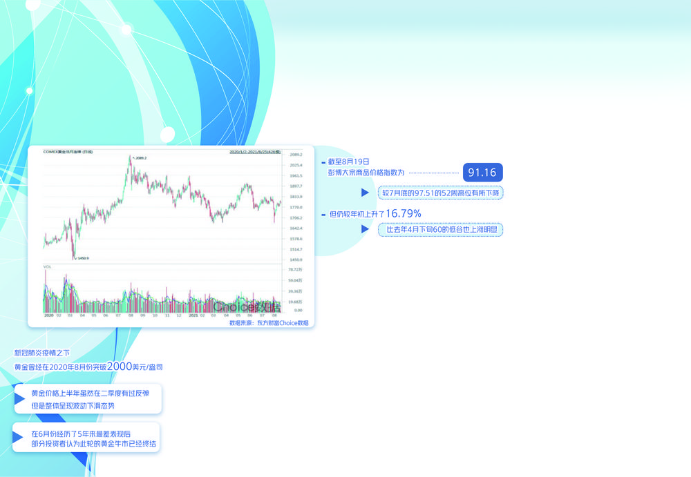 如果在3个月前,连续5个季度跑赢其他大类资产的大宗商品无疑是投资的热选,部分投资者甚至抛出了大宗商品“超级周期论”。然而,大宗商品近两个月的表现,尤其是8月份的悉数回落已经转变了这一看法。截至8月19日,彭博大宗商品价格指数为91.16,较7月底的97.51的52周高位有所下降,但仍较年初上升了16.79%,比去年4月下旬60的低谷也上涨明显。