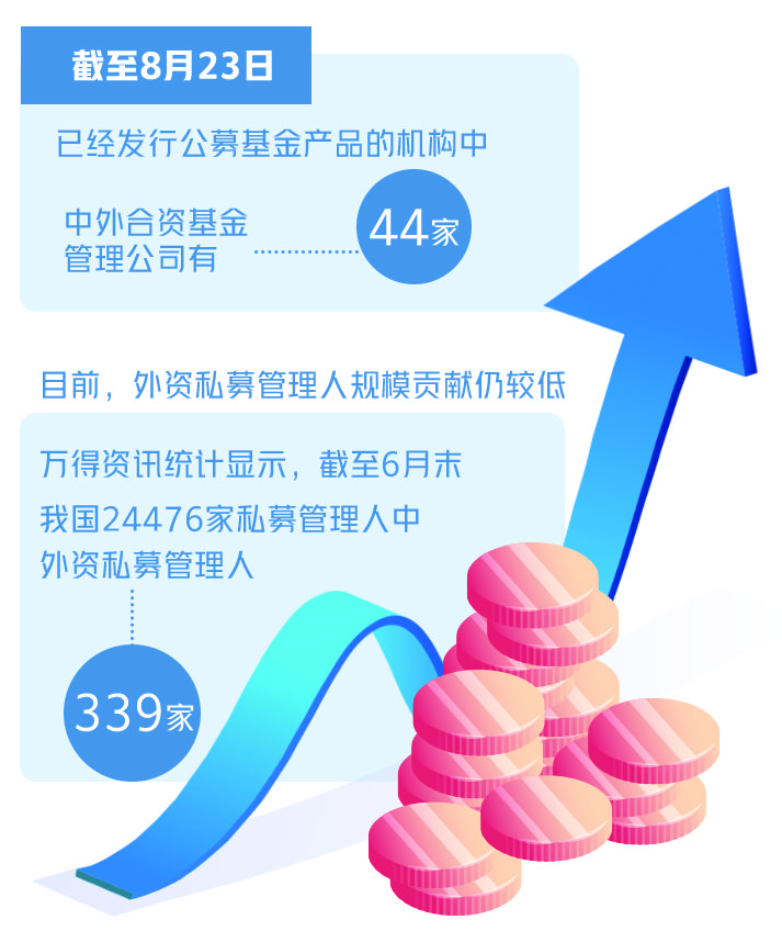 在私募基金方面,目前,外资私募管理人规模贡献仍较低。万得资讯统计显示,截至6月末,我国24476家私募管理人中(整体管理规模17.9万亿元,其中私募证券规模4.87万亿元),外资私募管理人339家,占私募管理人总数量的比例为1.4%。
