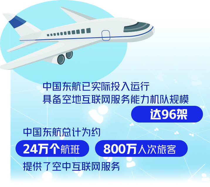 中国东航航线覆盖了全部国际远程航班及国内重点商务航线,其“空中互联”机队规模、航班数量、用户人数均实现了“中国第一、亚洲领先”。目前,中国东航已实际投入运行具备空地互联网服务能力机队规模达96架,其中包括行业内领先的A350、B787等明星机型,总计为约24万个航班800万人次旅客提供了空中互联网服务。