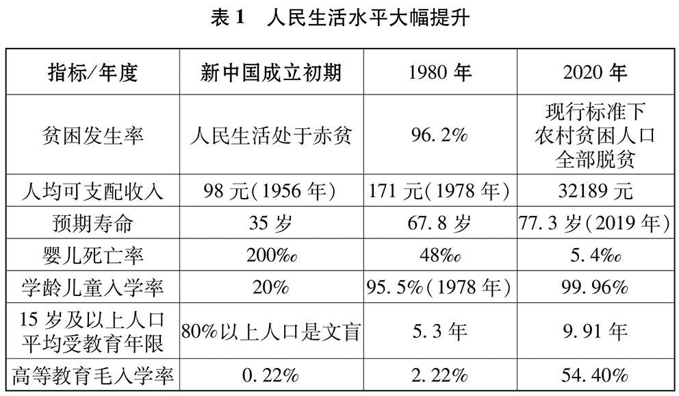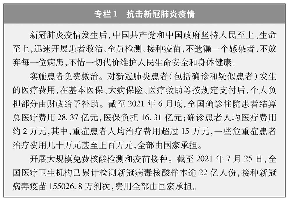 人民生活极大改善。中国人民摆脱绝对贫困,从总体小康到全面小康,过上了日益富足的生活,获得感幸福感安全感不断增强,生存权发展权有效保障。人均国民总收入超过1万美元,处于中等偏上收入经济体行列,正在向高收入国家迈进。城乡居民生活水平差距大幅缩小,形成了超过4亿人的世界上规模最大的中等收入群体。就业局势保持总体稳定,截至2020年底,全国就业人数为75064万人。中国建成世界上规模最大的社会保障体系,截至2021年6月底,全国基本养老、失业、工伤保险参保人数分别达到10.14亿人、2.22亿人、2.74亿人,基本医疗保险覆盖超过13亿人。健全完善社会救助制度,困难群众基本生活有效保障。幼有所育、学有所教、劳有所得、病有所医、老有所养、住有所居、弱有所扶更好实现。文化事业和文化产业繁荣发展,人民的精神生活更加丰富、更加活跃。生态文明建设取得丰硕成果,人民生活的家园天更蓝、山更绿、水更清。中国长期保持社会和谐稳定、人民安居乐业,是世界上公认的最有安全感的国家之一。