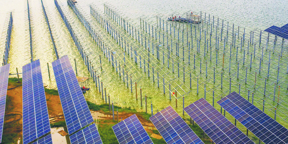 8月26日,在江西吉水县水田乡新市村的光伏发电项目施工现场,工人在安装光伏支架、晶硅光伏板。该“渔光互补”光伏发电项目是吉水县扶持壮大村级集体经济项目,预计10月初可实现并网发电。