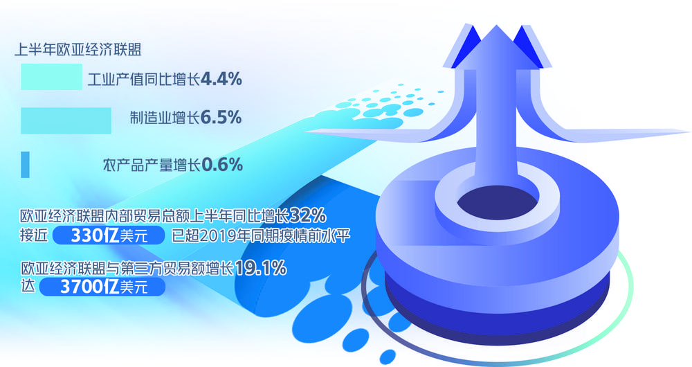 与会成员国首脑对该组织经济复苏和贸易发展状况感到满意。俄罗斯总理米舒斯京在会上表示,疫情期间欧亚经济联盟能快速灵活适应各种变化和挑战,成员国联合行动,经济正逐渐复苏。数据显示,上半年该组织工业产值同比增长4.4%,制造业增长6.5%,农产品产量增长0.6%。与此同时,贸易动态也保持良好势头,该组织内部贸易总额上半年同比增长32%,接近330亿美元,已超2019年同期疫情前水平;与第三方贸易额增长19.1%,达3700亿美元。