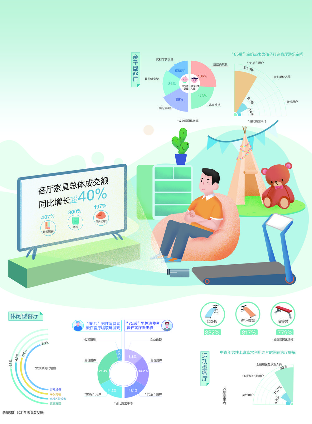 随着年轻人成为消费主力军,追求个性、注重性价比和体验感渐成主流消费趋势,这一点,在客厅经济的发展上表现得淋漓尽致。有预测显示,2021年中国客厅经济的整体商业价值总量将达到6300亿元。