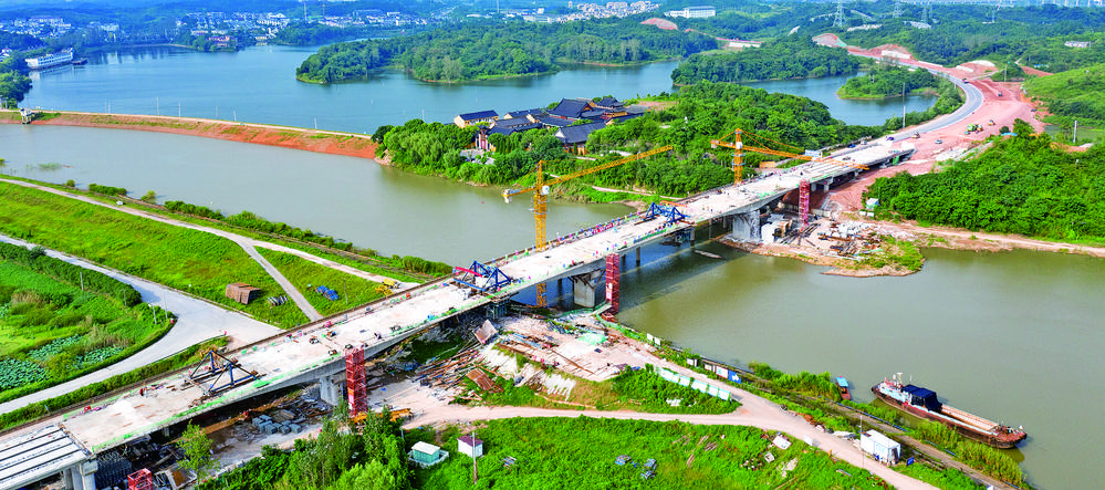 8月28日,在安徽省铜陵、池州两市交界的G236青通河大桥改建工程左幅主桥合龙作业现场,施工人员进行合龙施工。
