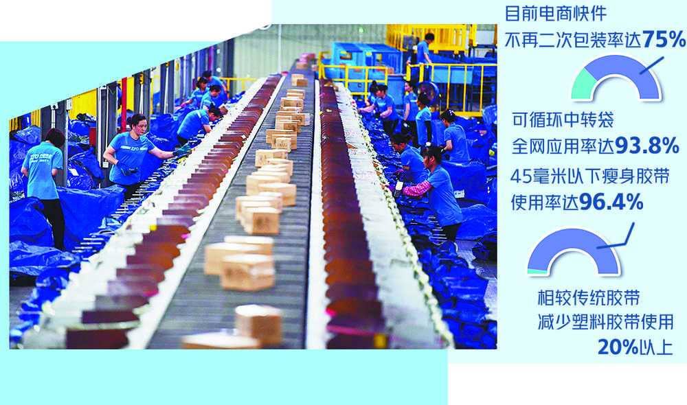 目前,全国电子运单使用基本实现全覆盖,电商快件不再二次包装率达75%,可循环中转袋全网应用率达93.8%,每年可替代传统的一次性塑料编织袋43亿条;45毫米以下瘦身胶带使用率达96.4%,相较传统胶带减少塑料胶带使用20%以上;共有9万个邮政快递网点设置了包装废弃物回收装置,年可回收使用包装箱2亿个。邮件快件包装绿色化、减量化和循环化均取得明显进展。