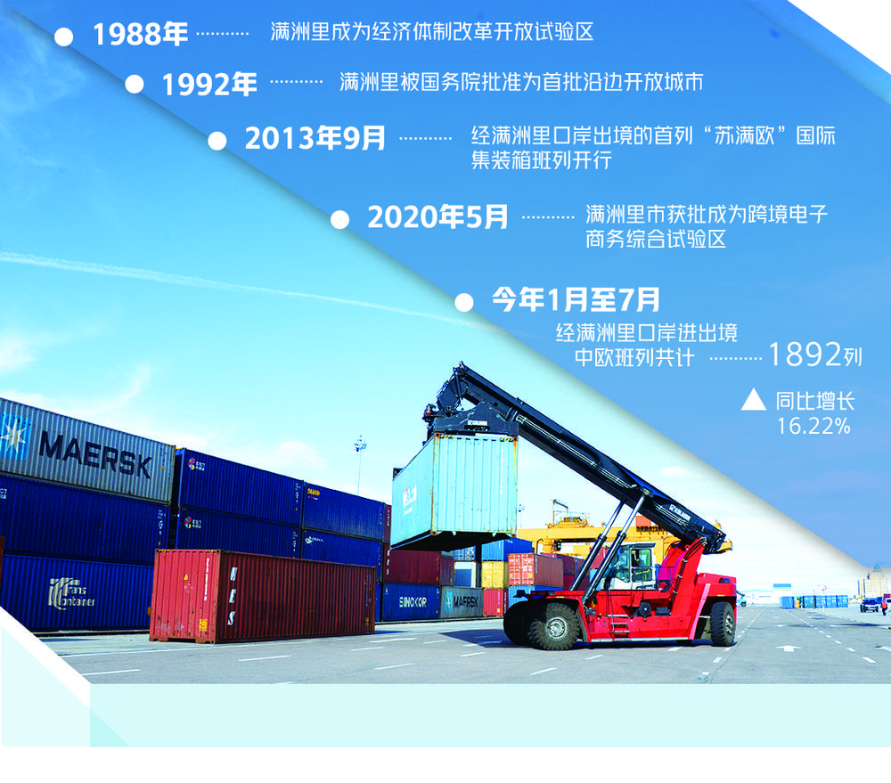 满洲里口岸是全国最大的陆路口岸,地处东北亚经济圈中心,是亚欧第一大陆桥的战略节点和重要的国际大通道,也是“一带一路”陆路通道上的重要节点。“一眼望俄蒙,三国闻鸡鸣”是满洲里口岸区位优势的形象描述。据满洲里海关统计,2020年,经满洲里铁路口岸进出境中欧班列共计3079列,同比增长42.09%,货值341.69亿元,同比增长30.95%。今年1月至7月,经满洲里口岸进出境中欧班列共计1892列,同比增长16.22%,载运15.23万个标准集装箱,同比增加8.36%,总货值约合人民币189.31亿元。