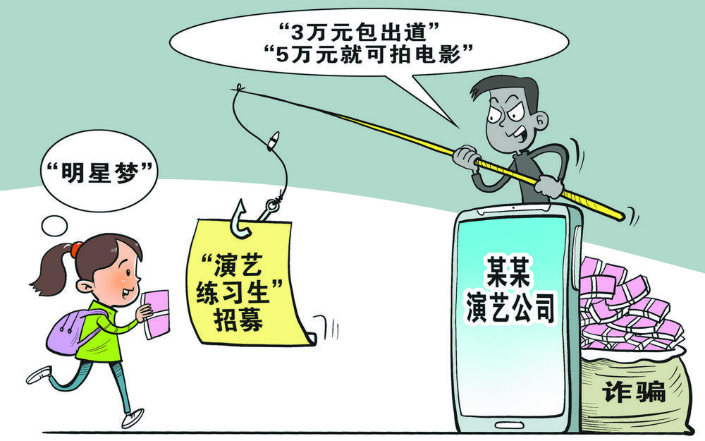 “3万元包出道”“5万元就可拍电影”……一段时间以来,不少网络社交平台常常发布各种“练习生招募”信息。然而,一些练习生选拔实际上只是“钓鱼”行为,打着“选拔”的幌子对怀揣“明星梦”的青少年敛财。被“招募”的年轻人还可能遭遇各种“续费”要求。对此,广大青少年和监护人需擦亮眼睛谨慎甄别,不要轻信网络上不明身份者的许诺。当有自称“星探”的人主动联系时,一定要查验对方公司资质及其真实身份,避免被忽悠,警惕可能存在的涉嫌诈骗诱导收费与签约行为。