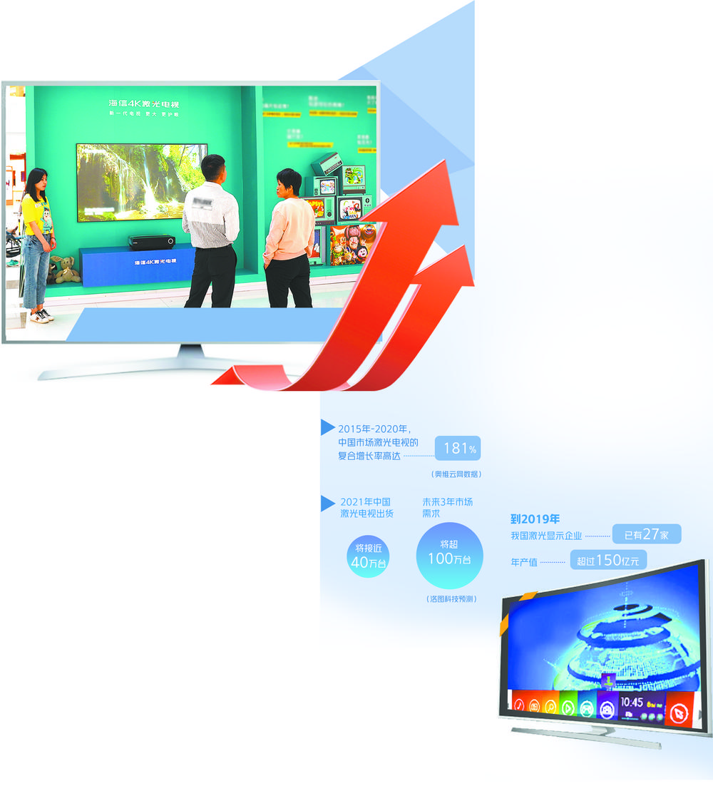 奥维云网数据显示,2015年-2020年,中国市场激光电视的复合增长率高达181%。洛图科技预测,2021年中国激光电视出货将接近40万台,同比增长超80%,未来3年市场需求将超100万台。