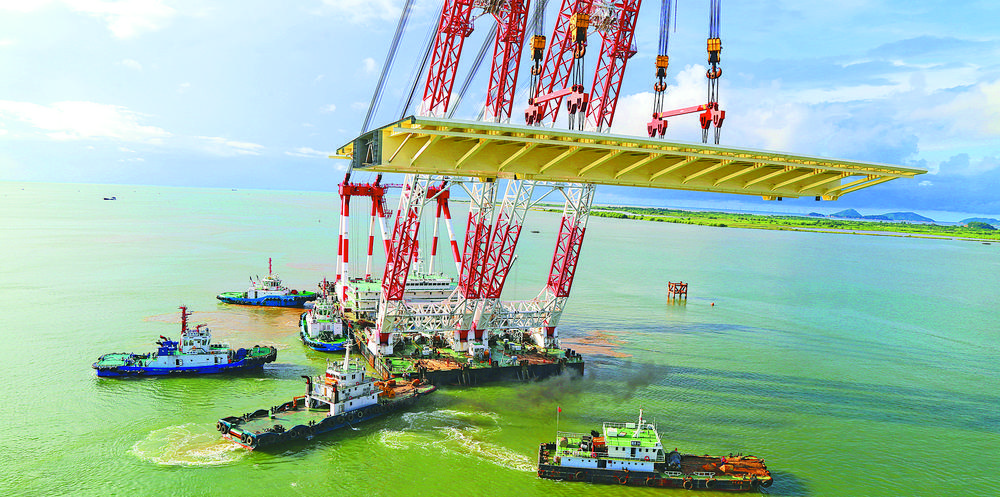 九月一日,世界首座公铁同层多塔斜拉桥——珠机城际金海特大桥最长最重钢箱梁“落户”广东珠海市鹤洲岛,顺利完成大桥鹤洲侧首孔钢箱梁架设。孟庆虎摄(中经视觉)