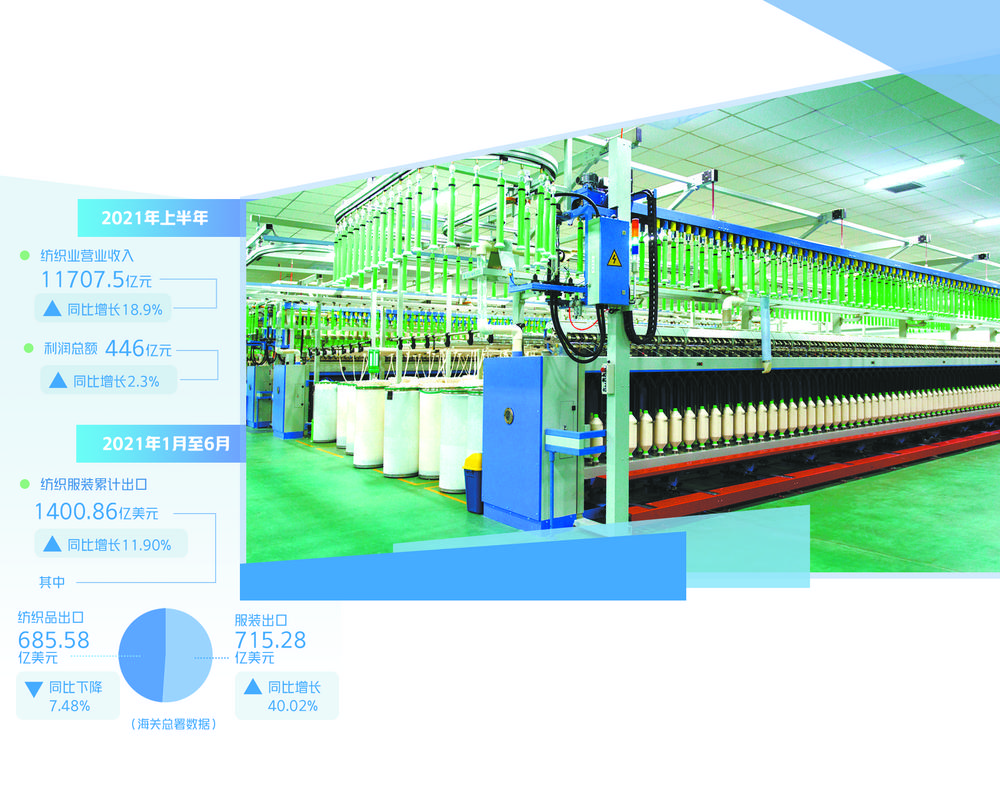 受内需市场驱动,叠加海外订单回流,上半年我国纺织业经营情况逐步好转,营收稳步增长,利润由负转正。数据显示,2021年上半年,纺织业营业收入11707.5亿元,同比增长18.9%;利润总额446亿元,同比增长2.3%。