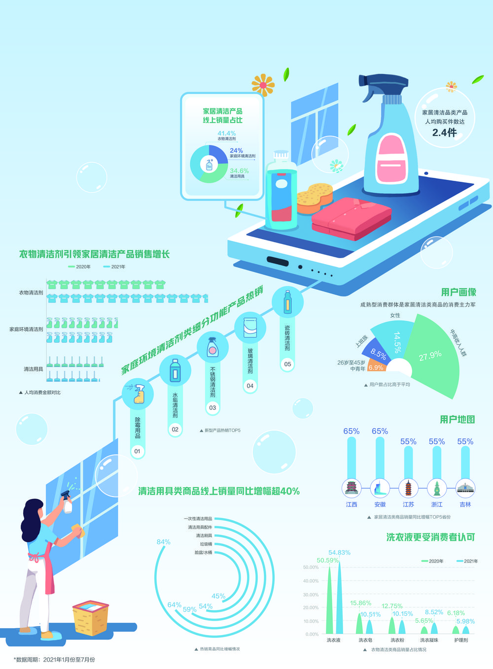 消费升级体现在量和质两个维度。一方面,居民生活水平的提升和健康卫生意识的增强,推动家居清洁产品的人均购买数量和消费金额保持明显增长。另一方面,消费者对品质提出了更高要求,抑菌、环保、天然等附加价值受到更多关注;“一屋通用”已经过时,针对不同清洁场景,产品划分越来越细,新概念层出不穷、产品迭代速度加快。