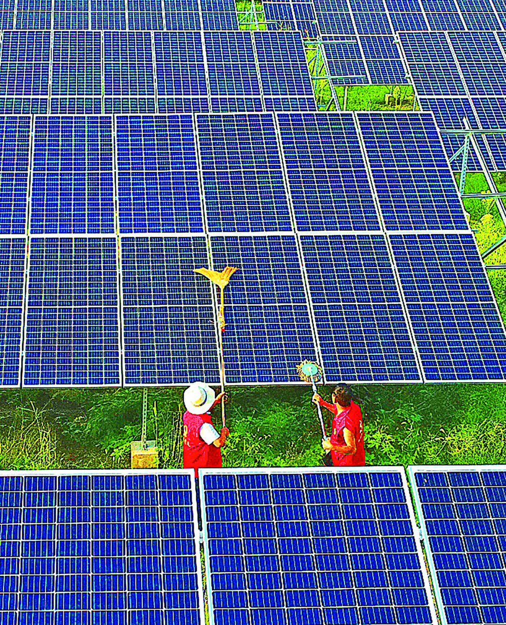 九月三日,山东阳谷县西湖镇苏王董村光伏发电站,党员志愿者在义务清洁光伏板。近年来,当地指导基层党组织利用闲散宅基地等建设光伏电站,助力乡村振兴。