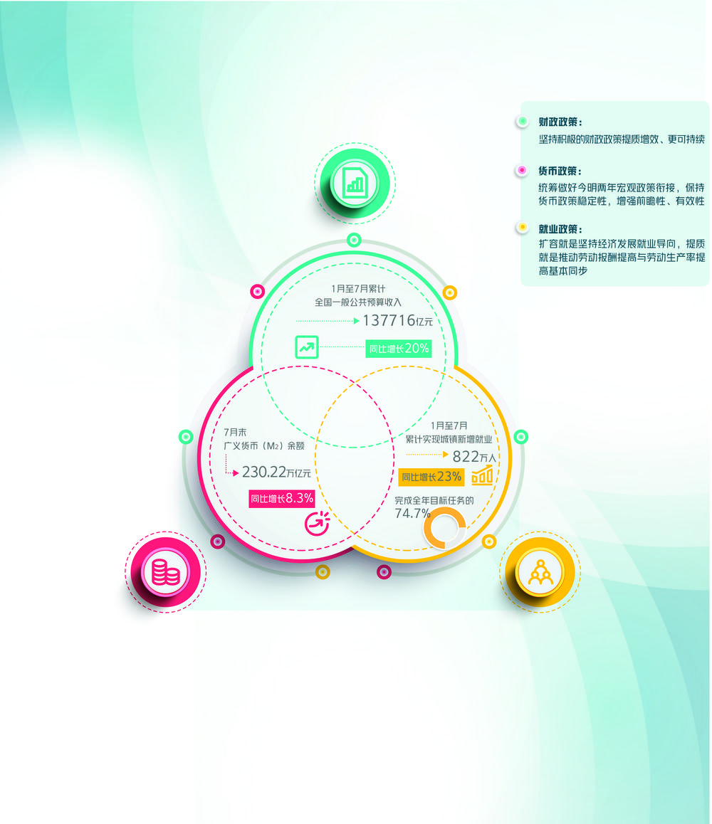 今年以来,积极的财政政策体现出“提质增效、更可持续”的特点。统计显示,1月至7月累计,全国一般公共预算收入137716亿元,同比增长20%,比2019年同期增长9.6%。支出方面,前7月全国一般公共预算支出137928亿元,同比增长3.3%。