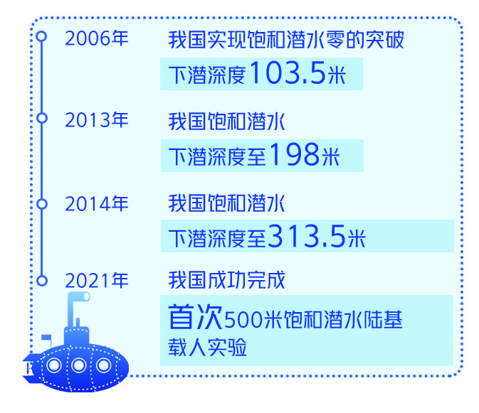 2006年,我国实现饱和潜水零的突破,下潜深度103.5米,2013年下潜深度增至198米,2014年用饱和潜水作业方式创造了313.5米的国家饱和潜水纪录。可从300米至500米用了整整7年时间。