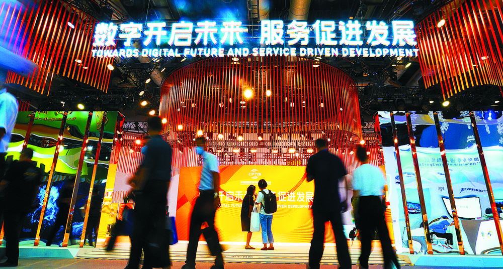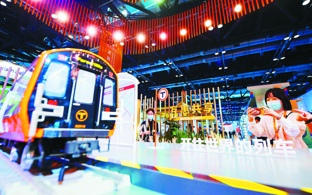 ①观众在2021年中国国际服务贸易交易会智慧交通服务展位“开往世界的列车”前拍照。服贸会是全球服务贸易领域规模最大、内容最丰富的国际展会,也是我国促进高水平对外开放的重要平台。