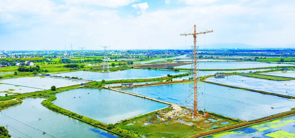 9月8日,白鹤滩—江苏±800千伏特高压直流输电线路工程(苏2标段)现场,工人在组装铁塔。该工程建成后可有效改善江苏的电网调节能力。史 俊摄(中经视觉)