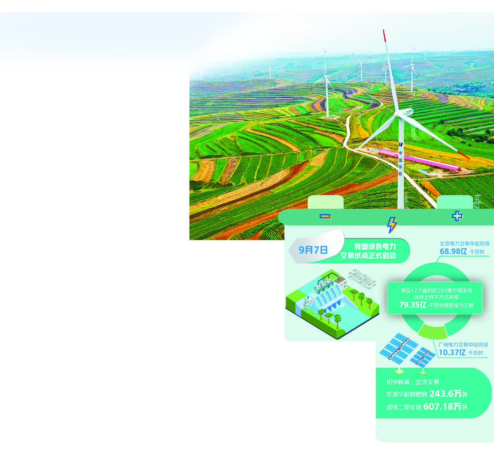 9月7日,来自17个省份的259家市场主体,以线上线下方式完成了79.35亿千瓦时绿色电力交易,这是当天我国绿色电力交易试点正式启动后的首次交易。