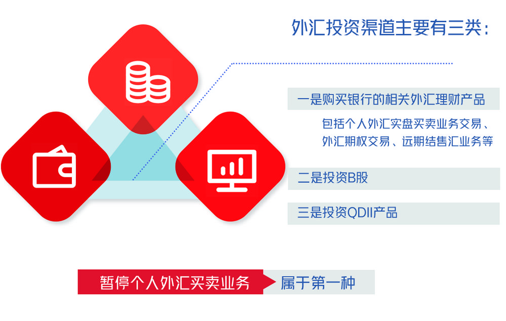 对于外汇投资,当前合法的投资渠道主要有三类:一是购买银行的相关外汇理财产品,包括个人外汇实盘买卖业务交易、外汇期权交易、远期结售汇业务等;二是投资B股;三是投资QDII产品。此次华夏银行暂停个人外汇买卖业务,属于上述第一种。