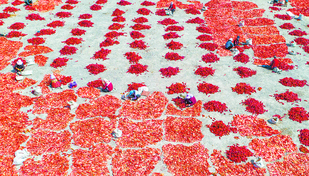 9月11日,在新疆库车市伊西哈拉镇红旗社区晾晒地,群众抢抓天气晴好时机,将刚收获的辣椒分拣晾晒。
