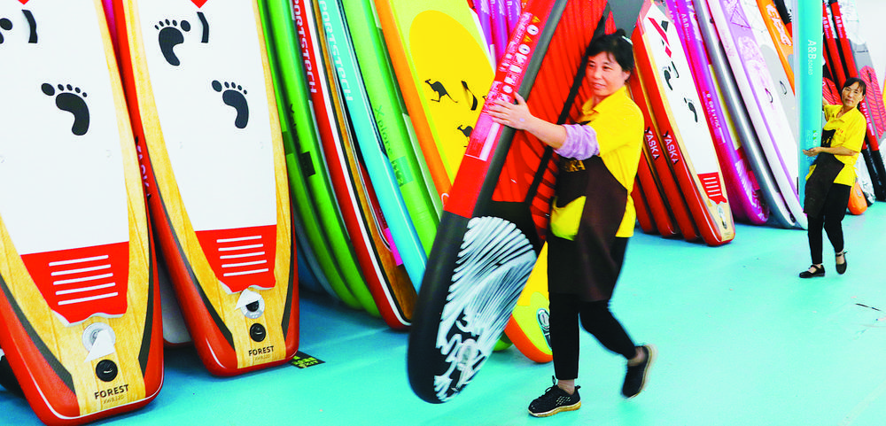 ▲位于安徽庐江县高新区的雅斯佳休闲用品有限公司,一直致力于水上运动和休闲产业产品制造,年产各种规格的冲浪板10万只,远销50多个国家和地区。今年1月至8月,已实现500万美元的出口额。巢志斌摄(中经视觉)