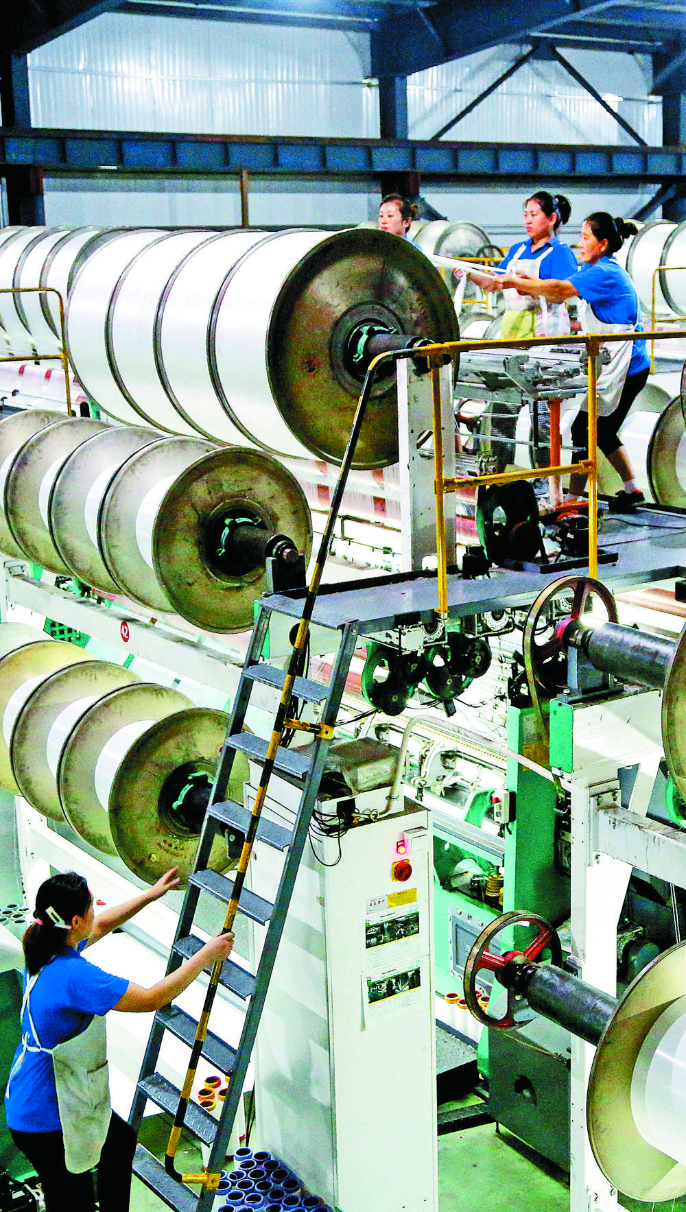 ▼位于江苏连云港海州经济开发区的连云港鹰游纺机公司,工人在毛绒面料生产线上忙碌。近年来,该公司加大技术创新力度,多个纺机项目填补国内空白,毛绒面料加工成外贸出口主打产品。王 春摄(中经视觉)