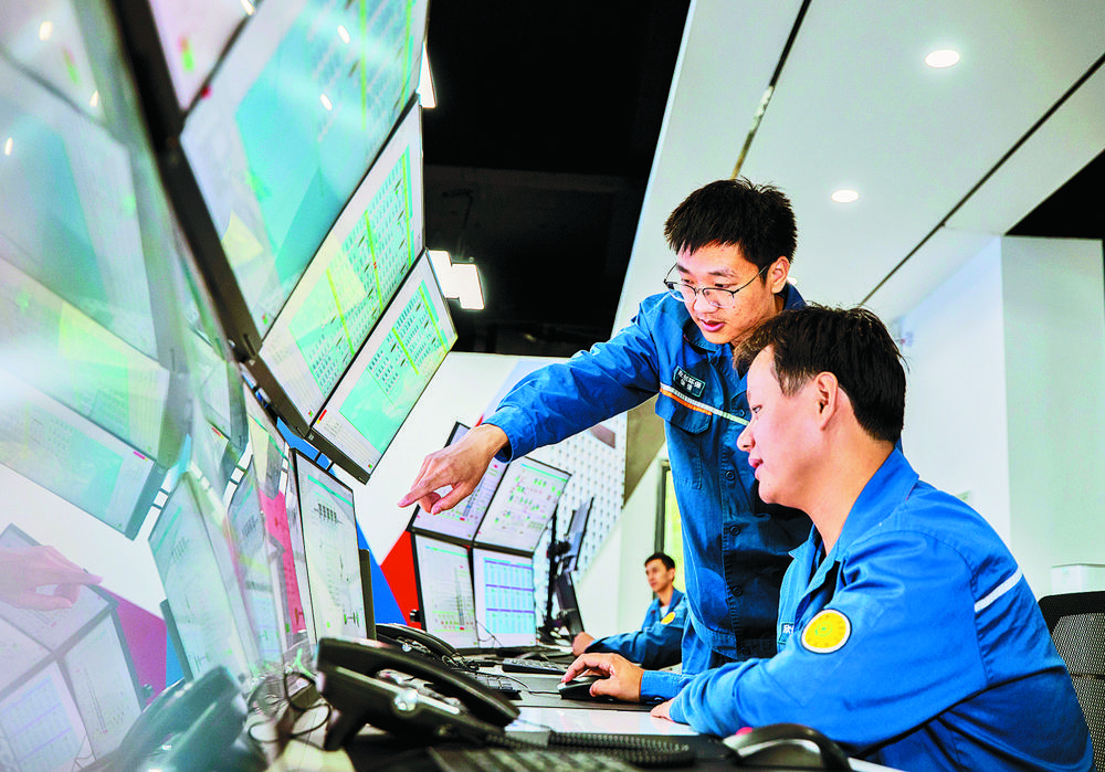 ▼国家“专精特新”小巨人企业、安徽欣创节能环保科技股份有限公司智慧环控中心员工在监控环保设施运行情况。近年来,该公司聚焦大气环境治理等核心业务,已成功为200多家冶金、煤化工、电力企业完成脱硫、除尘、烟气治理、降低颗粒物粉尘排放等技术改造服务,高效助力低碳减排。罗继胜摄(中经视觉)