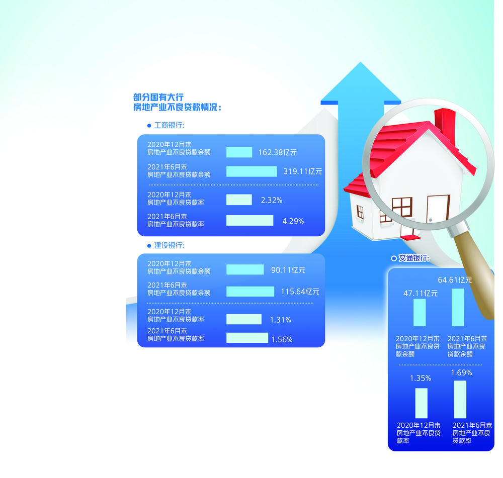 从国有大行已披露数据看,截至2021年6月末,中国工商银行、中国建设银行、交通银行的房地产业不良贷款余额分别为319.11亿元、115.64亿元、64.61亿元,较去年年末上升156.73亿元、25.53亿元、17.50亿元;房地产业不良贷款率分别为4.29%、1.56%、1.69%,较去年年末上升1.97个百分点、0.25个百分点、0.34个百分点。