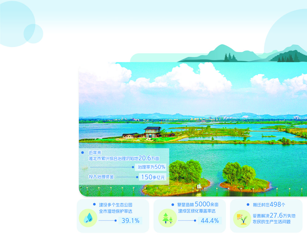 近年来,淮北市贯彻落实新发展理念,持续实施矿山地质环境大治理大修复大保护,着力推进经济社会发展全面绿色转型,探索形成“深改湖,浅造田,不深不浅种藕莲”“稳建厂,沉修路,半稳半沉栽上树”的治理模式,累计综合治理沉陷地20.6万亩,治理率为50%,投入治理资金150多亿元,成功将昔日煤灰蔽日的“矿山城市”打造成山水在城中、城在山水中的“公园城市”。