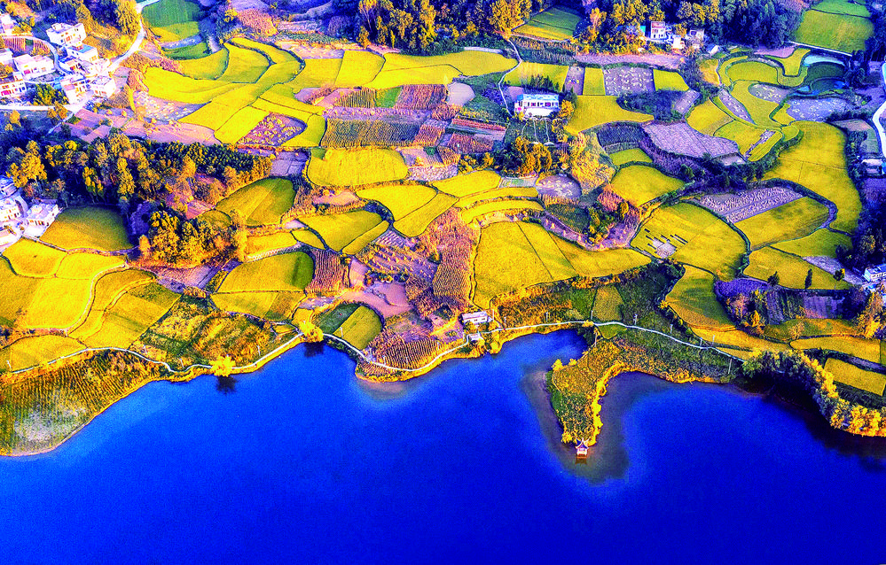 贵州省黔西市绿化乡大海子村稻田。时下,贵州省各地的水稻陆续成熟,田野山岗,一派丰收景象。范 晖摄(新华社发)