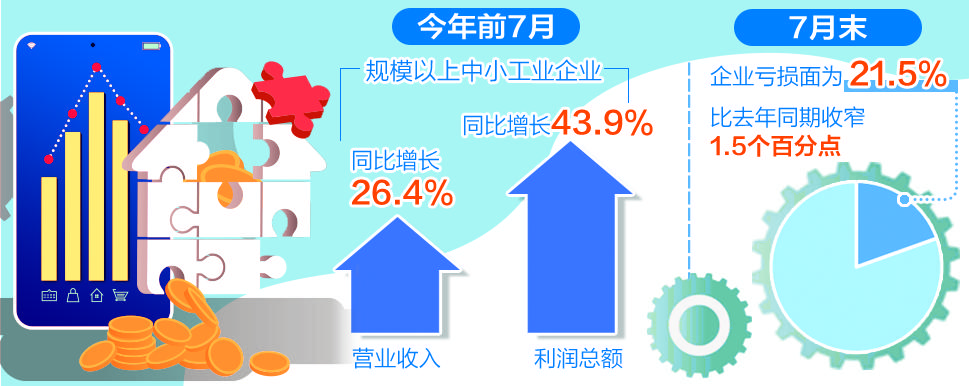 今年前7个月,规模以上中小工业企业营业收入和利润总额分别同比增长26.4%和43.9%。7月末,企业亏损面为21.5%,比去年同期收窄1.5个百分点。总体来看,中小企业效益不断扩大。