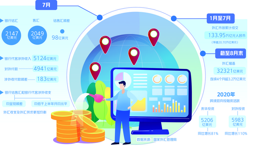 国家外汇管理局近期召开的下半年外汇管理工作电视会议认为,今年以来,外汇管理部门进一步深化外汇领域改革开放,促进跨境贸易投资便利化。具体来看包括推进贸易外汇收支便利化试点,提升个人用汇便利化水平,支持贸易新业态健康发展,开展跨国公司本外币一体化资金池业务试点,丰富跨境金融区块链服务平台应用场景等。数据显示,7月份我国外汇市场供求基本平衡。从主要指标表现看,银行结售汇和非银行部门涉外收支均呈现顺差,规模分别为98亿美元、183亿美元,均低于上半年月均水平,表明外汇收支及外汇供求更加均衡。今年1月至7月,外汇市场累计成交133.95万亿元人民币(等值20.70万亿美元)。