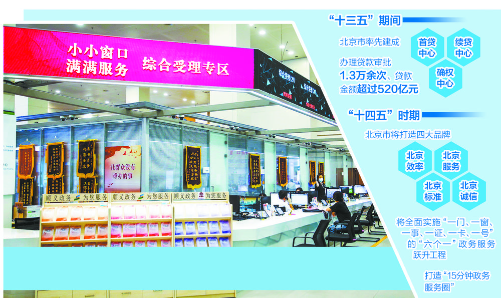 “十四五”时期,北京还提出率先建成审批最简、服务最优、企业群众满意度最高的国际一流政务服务先行示范区。北京市政务服务管理局副局长刘强介绍,北京市将全面实施“一门、一窗、一事、一证、一卡、一号”的“六个一”政务服务跃升工程,打造“15分钟政务服务圈”,实现高频政务服务事项步行15分钟范围内即可办理。