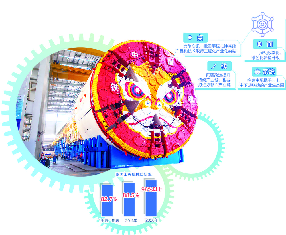 中国工程机械工业协会会长苏子孟介绍,随着产业链水平提升,国内工程装备保障能力显著增强,一大批自主研发的重大工程机械技术装备基本满足了我国国民经济和重大基础设施建设所需。我国工程机械自给率从“十五”期末的82.7%提高到2011年的88.5%,2020年达到96%以上。