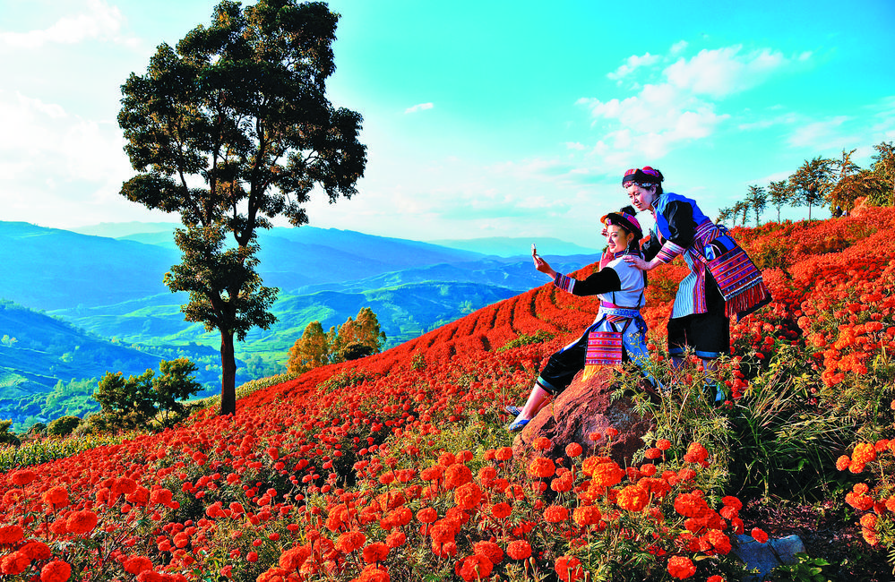 菊开游客来 作者 普佳勇 2017年8月19日,云南红河哈尼族彝族自治州弥勒市西二镇万寿菊田园,花农与花争美。