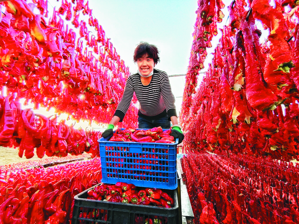 火红的日子 作者 吴红军 2020年9月18日,新疆哈密市巴里坤哈萨克自治县三塘湖镇,当地村民在晾晒辣椒。