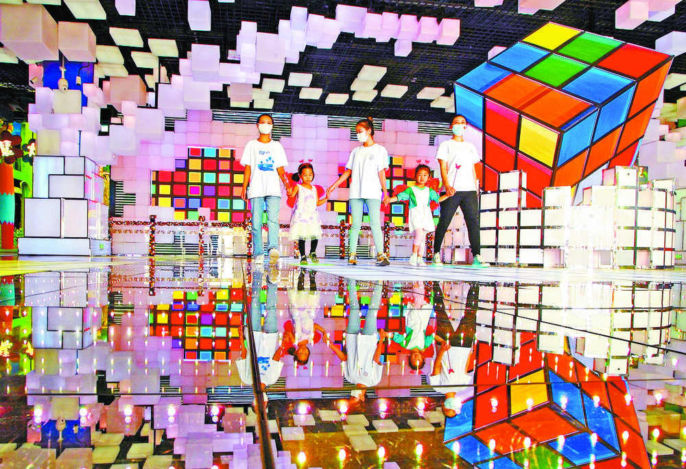 9月20日,河北迁安市天元谷旅游度假区,游客在“奇幻魔方”参与打卡。当地旅游景区在节日期间推出系列活动,为游客提供优质安全的服务。梁玉水摄(中经视觉)