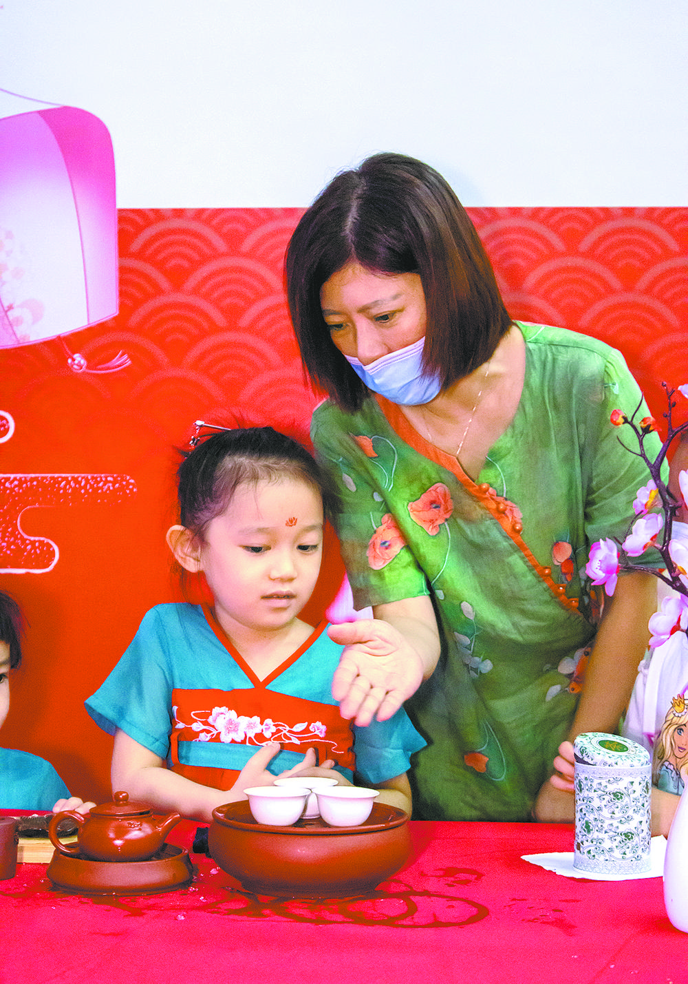 9月19日,广东省非物质文化遗产保护中心推出节庆“叹”非遗——中秋节系列活动,潮州工夫茶艺非遗区级代表性传承人林秀玲向小朋友介绍潮州工夫茶艺体验项目。本报记者 张建军摄